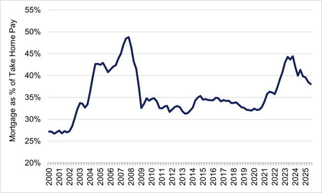 Affordability remains a major barrier. Mortgage payments account for 38% of take-home pay for first-time buyers in the Outer South East, above both the long-term average of 34% and the 30% affordability threshold. Although this has eased as mortgage rates have fallen, rising private rents continue to make it harder for buyers to save for deposits.