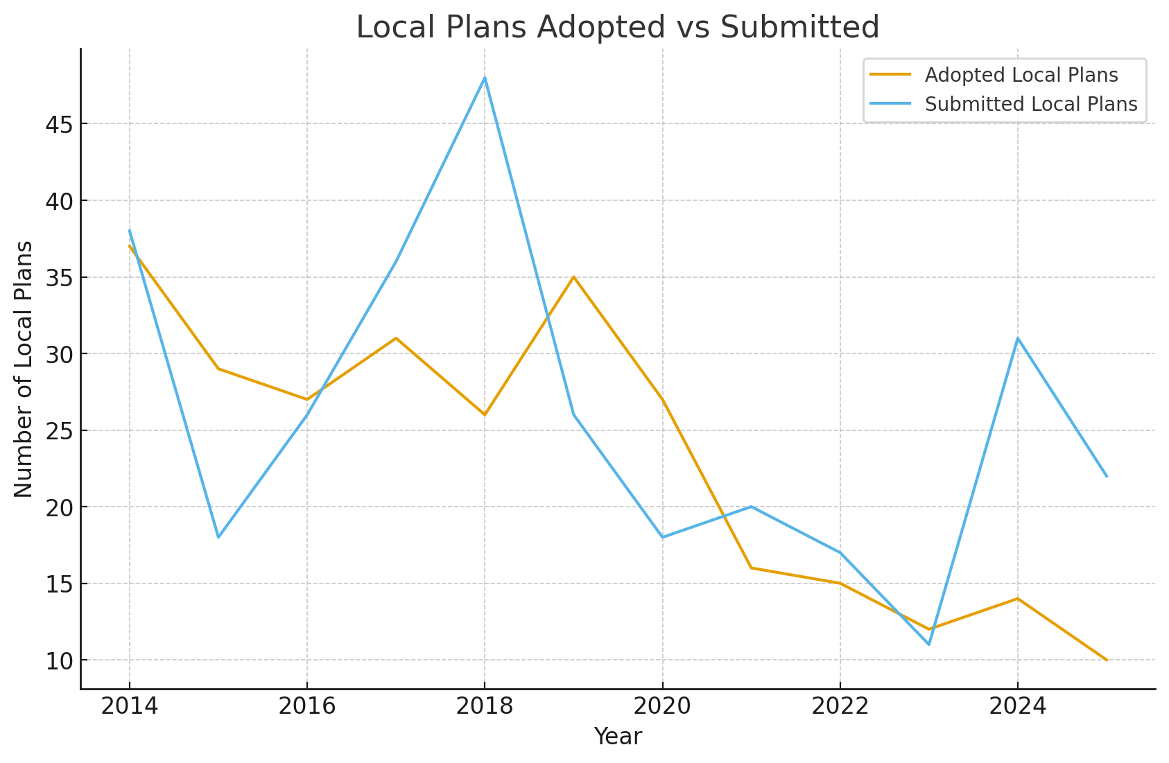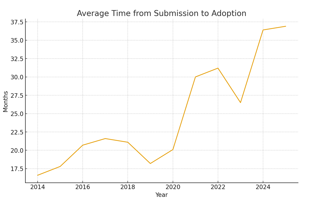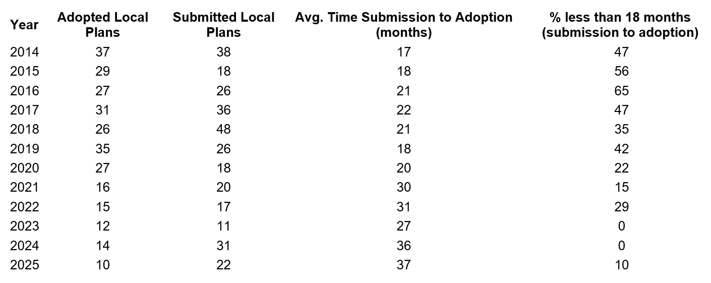 While submissions are increasing, the time taken to move from submission to adoption has deteriorated sharply. The second chart illustrates this clearly. A decade ago, around half of all examinations that reached adoption were completed in under 18 months. In the last three years, only one authority has managed to achieve that benchmark (hats off to you, West Suffolk). The current average time from submission to adoption is now approximately 37 months, double the typical timescales seen in the mid-2010s.