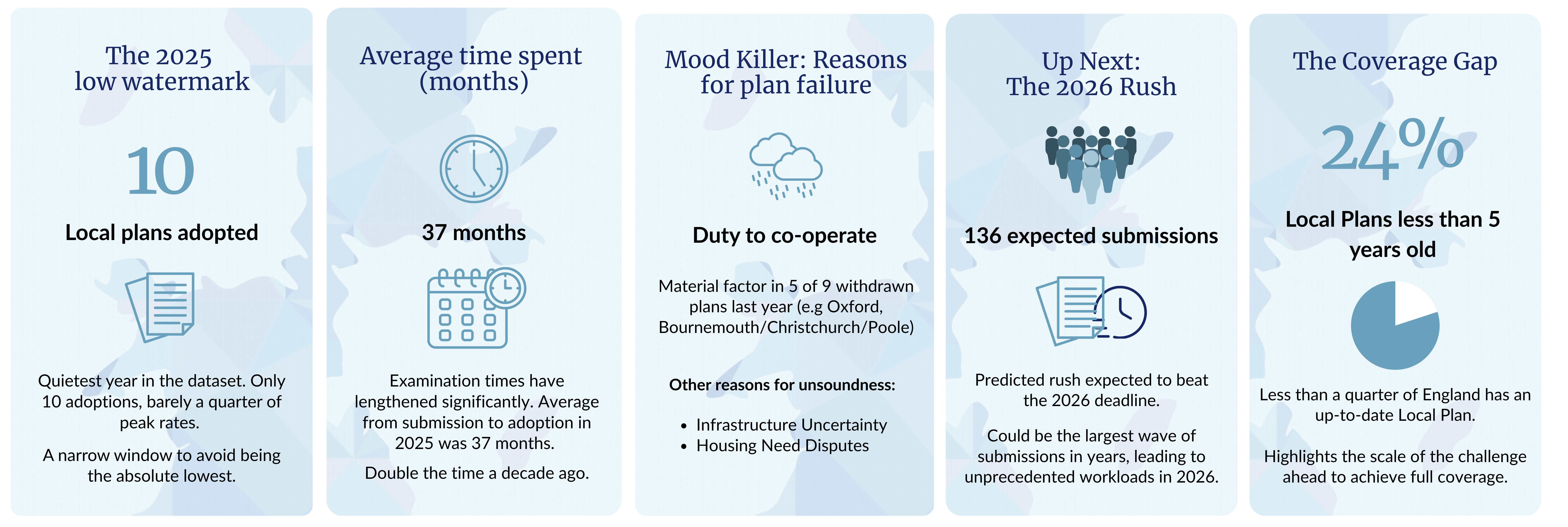 Looking at; the number of Local Plans now in the system; the many more on the way; and, the watering down of the biggest barrier to soundness coverage, it is easy to see how we could rise rapidly from the current low watermark of 24 percent Local Plan coverage nationally. How high we can go will depend on the number of plans that can be submitted before the end of 2026, when a new system is likely to cause a cliff edge of submissions, and on the robustness of these submissions. Authorities will be under severe pressure to get local plans in and this may mean not all evidence bases will be watertight. Set against this, we will have Local Plan Inspectors weighed down by huge workloads and instructed not to give authorities longer than six months to resolve any post-submission issues. Our 2026 Wrapped could paint a very different picture.