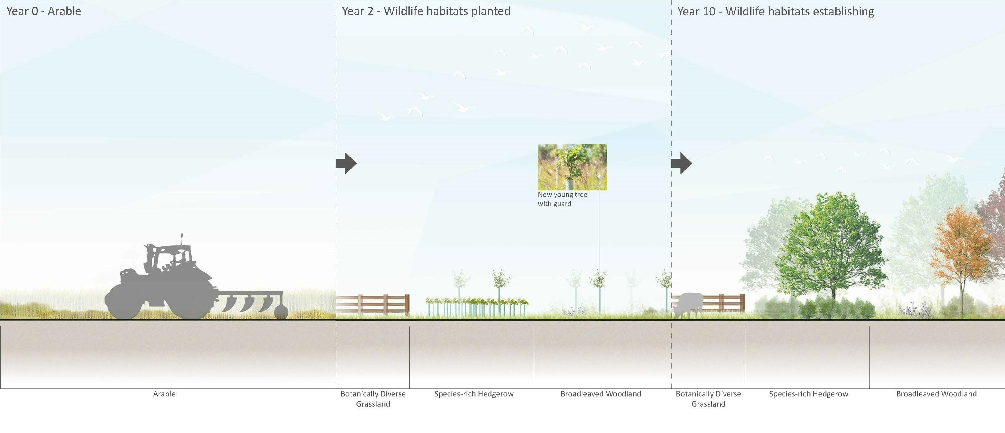 The scheme will see the existing arable farmland converted to biodiverse habitats through habitat creation and enhancement. The habitats will be managed for at least 30 years.